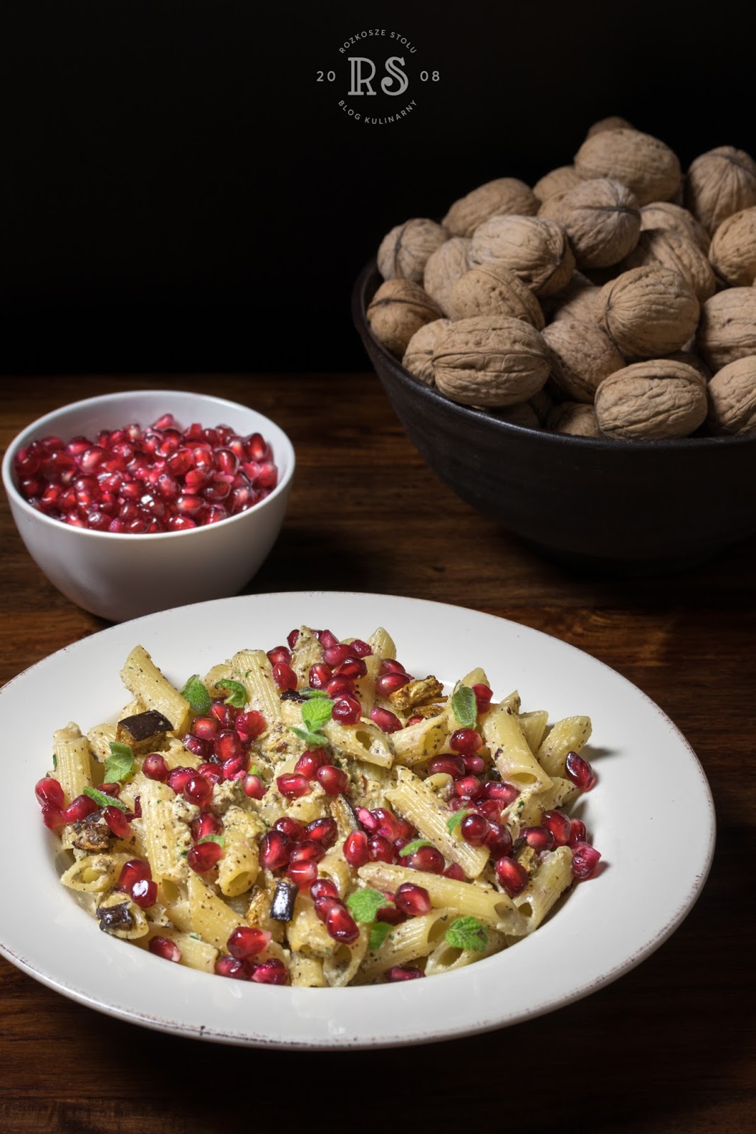 Makaron z sosem orzechowym to idealne danie zimowe. Ma milion kalorii, ale przecież orzechy są zdrowe, do tego nie wymaga wiele pracy. Pomysł podsunął mi wpis z magazynu Kuchnia dotyczący kuchni gruzińskiej, ale taki miks spokojnie mógłby powstać w kuchni bałkańskiej czy greckiej. Prawdę powiedziawszy o greckich granatach i orzechach myślałam, jak go robiłam... Moją wersję wzbogaciłam dodatkowo pieczonym bakłażanem, ale można poprzestać na samym sosie (a właściwie bardziej paście). Granat - moim zdaniem - jest obowiązkowy!